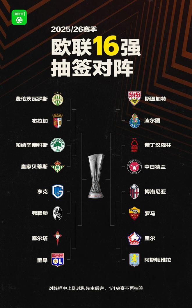 北京时间2月27日,2025/26赛季欧联淘汰赛抽签仪式在瑞士尼翁的欧足联总部进行,在淘汰赛中,维拉将迎战里尔,罗马与博洛尼亚进行同国内战。